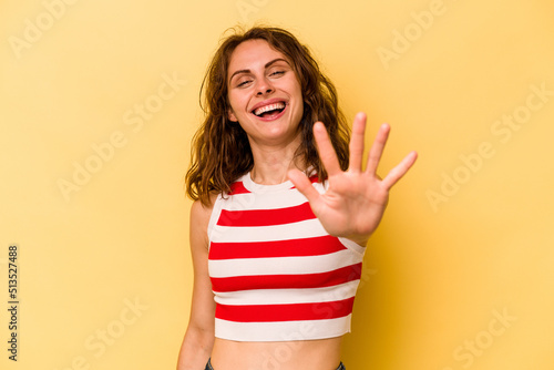 Young caucasian woman isolated on yellow background smiling cheerful showing number five with fingers.