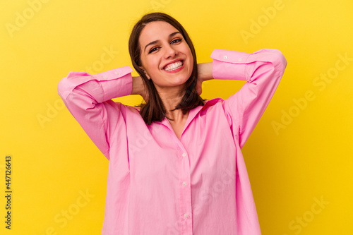 Young caucasian woman isolated on yellow background stretching arms, relaxed position.