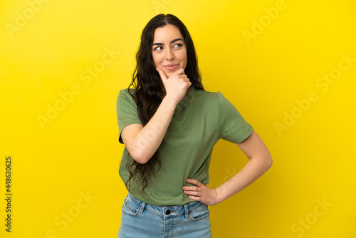 Young caucasian woman isolated on yellow background thinking an idea while looking up