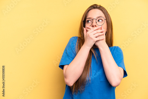 Young caucasian woman isolated on yellow background thoughtful looking to a copy space covering mouth with hand.