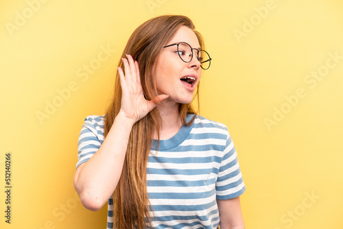 Young caucasian woman isolated on yellow background trying to listening a gossip.