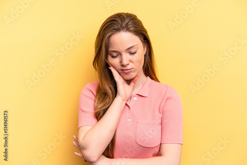 Young caucasian woman isolated on yellow background who is bored, fatigued and need a relax day.