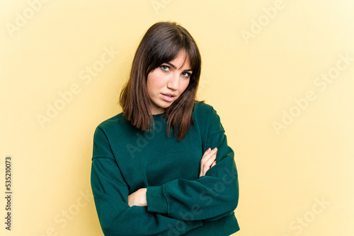 Young caucasian woman isolated on yellow background who is bored, fatigued and need a relax day.