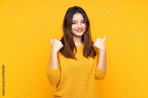 Young caucasian woman isolated on yellow background with thumbs up gesture and smiling