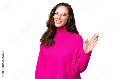 Young caucasian woman isolated over isolated background saluting with hand with happy expression