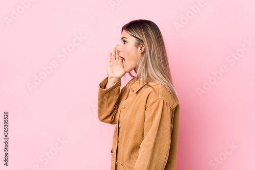 Young caucasian woman isolated shouting and holding palm near opened mouth.