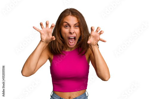 Young caucasian woman isolated showing claws imitating a cat, aggressive gesture.