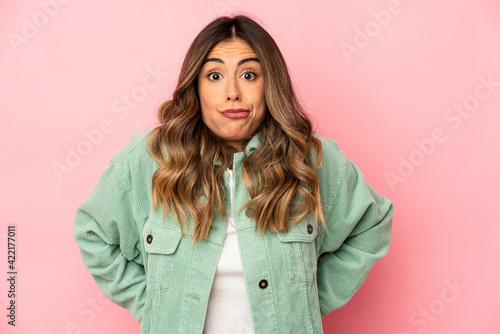 Young caucasian woman isolated shrugs shoulders and open eyes confused.