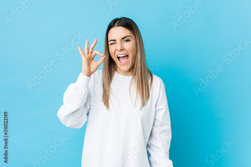 Young caucasian woman isolated winks an eye and holds an okay gesture with hand.