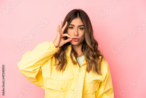 Young caucasian woman isolated with fingers on lips keeping a secret.
