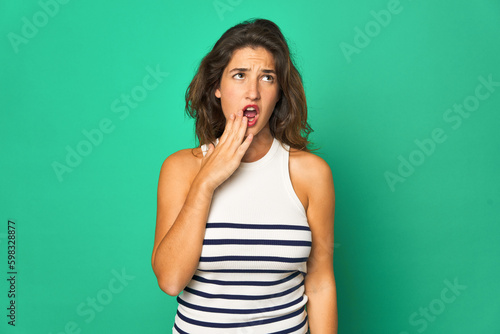 Young caucasian woman isolated yawning showing a tired gesture covering mouth with hand.