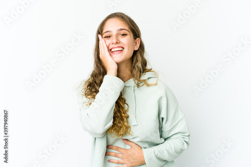 Young caucasian woman laughs happily and has fun keeping hands on stomach.