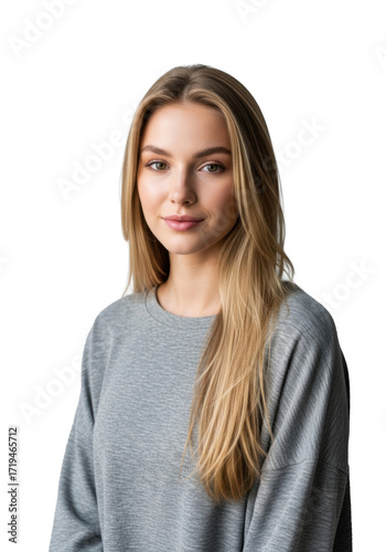 Young caucasian woman, light blonde hair, grey top, soft smile, looking at camera. Minimalist light grey studio with creamy bokeh, negative space. Concept of natural beauty and serenity