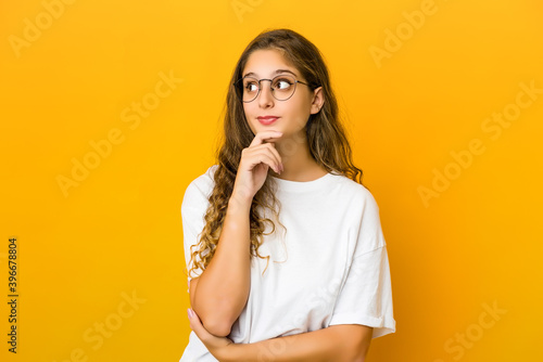 Young caucasian woman looking sideways with doubtful and skeptical expression.