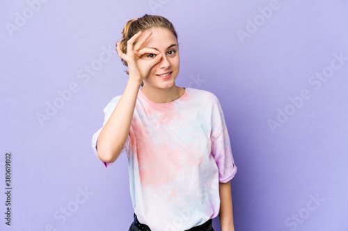 Young caucasian woman on purple background excited keeping ok gesture on eye.