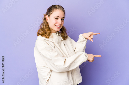 Young caucasian woman on purple background excited pointing with forefingers away.