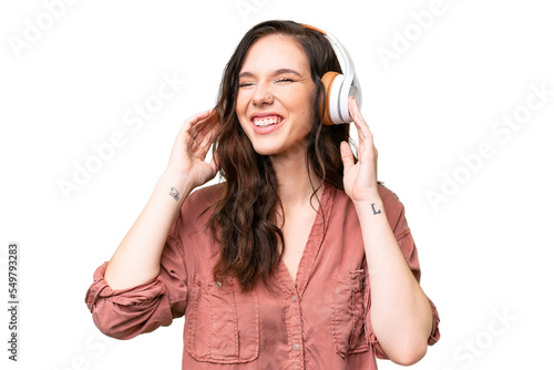 Young caucasian woman over isolated background listening music and singing