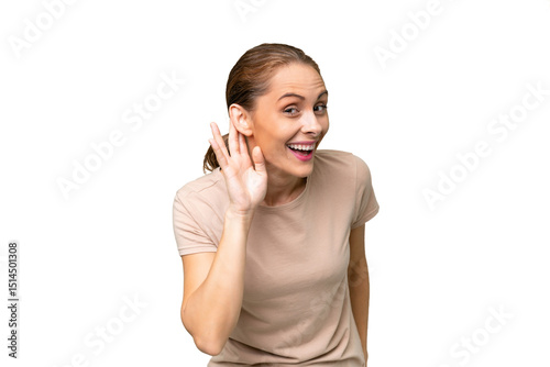Young caucasian woman over isolated background listening to something by putting hand on the ear