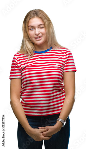 Young caucasian woman over isolated background winking looking at the camera with sexy expression, cheerful and happy face.