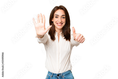 Young caucasian woman over isolated chroma key background counting six with fingers