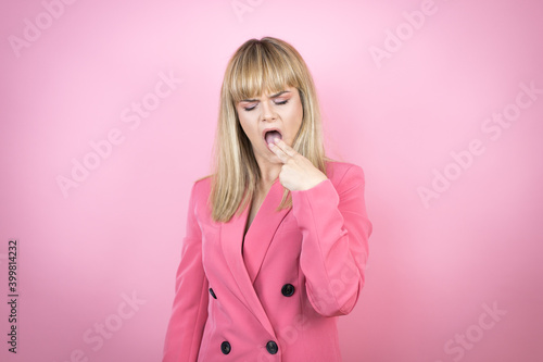 Young caucasian woman over isolated pink background disgusted with her hand inside her mouth