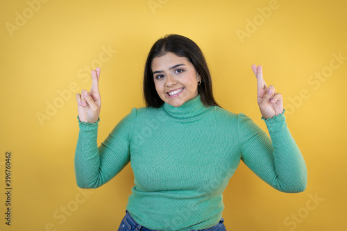 Young caucasian woman over isolated yellow background gesturing finger crossed smiling with hope and looking side