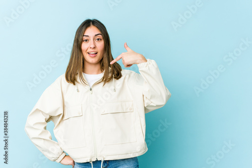 Young caucasian woman person pointing by hand to a shirt copy space, proud and confident