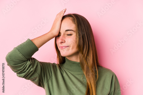 Young caucasian woman posing isolated forgetting something, slapping forehead with palm and closing eyes.