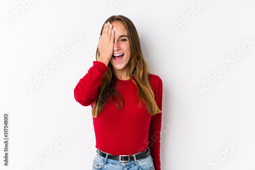 Young caucasian woman posing isolated having fun covering half of face with palm.
