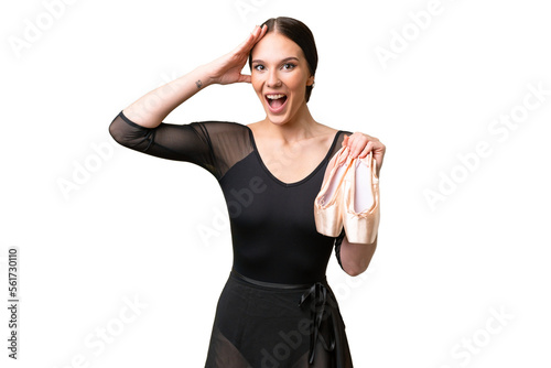 Young caucasian woman practicing ballet over isolated background with surprise expression
