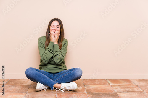 Young caucasian woman sitting on the floor isolated laughing about something, covering mouth with hands.
