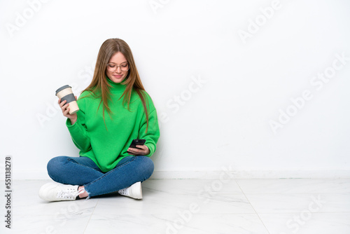 Young caucasian woman sitting on the floor isolated on white background holding coffee to take away and a mobile