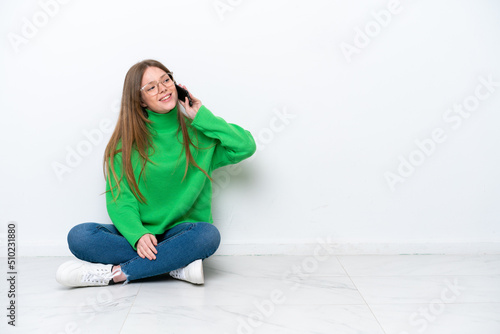 Young caucasian woman sitting on the floor isolated on white background keeping a conversation with the mobile phone