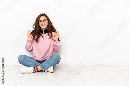 Young caucasian woman sitting on the floor isolated on white background showing an ok sign with fingers