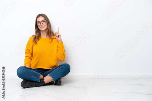 Young caucasian woman sitting on the floor isolated on white background showing and lifting a finger in sign of the best