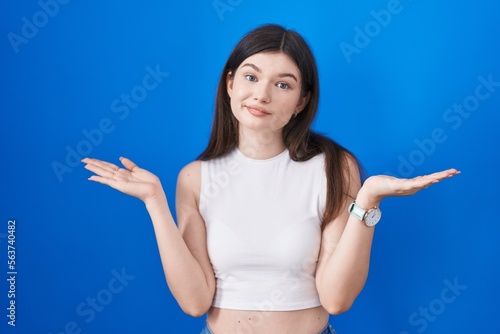 Young caucasian woman standing over blue background clueless and confused expression with arms and hands raised. doubt concept.