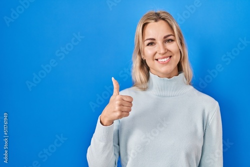Young caucasian woman standing over blue background doing happy thumbs up gesture with hand. approving expression looking at the camera showing success.