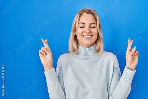 Young caucasian woman standing over blue background gesturing finger crossed smiling with hope and eyes closed. luck and superstitious concept.