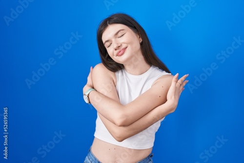 Young caucasian woman standing over blue background hugging oneself happy and positive, smiling confident. self love and self care