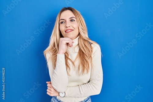 Young caucasian woman standing over blue background with hand on chin thinking about question, pensive expression. smiling with thoughtful face. doubt concept.