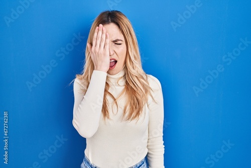 Young caucasian woman standing over blue background yawning tired covering half face, eye and mouth with hand. face hurts in pain.