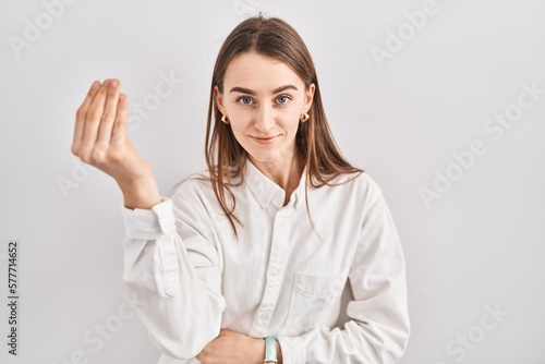 Young caucasian woman standing over isolated background doing italian gesture with hand and fingers confident expression