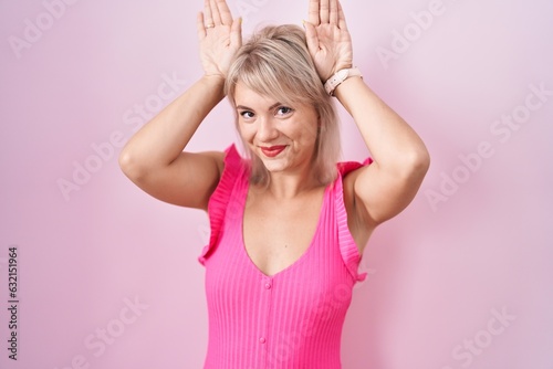 Young caucasian woman standing over pink background doing bunny ears gesture with hands palms looking cynical and skeptical. easter rabbit concept.