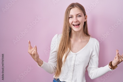 Young caucasian woman standing over pink background shouting with crazy expression doing rock symbol with hands up. music star. heavy music concept.