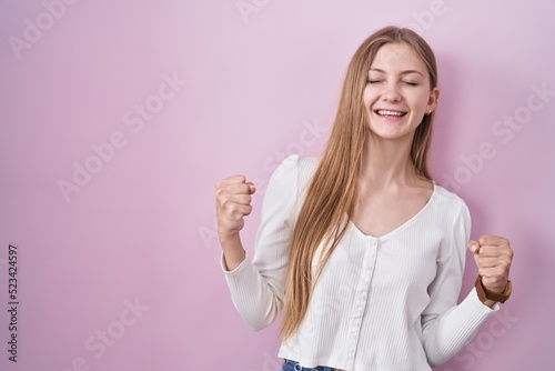 Young caucasian woman standing over pink background very happy and excited doing winner gesture with arms raised, smiling and screaming for success. celebration concept.