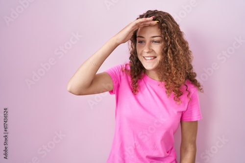 Young caucasian woman standing over pink background very happy and smiling looking far away with hand over head. searching concept.