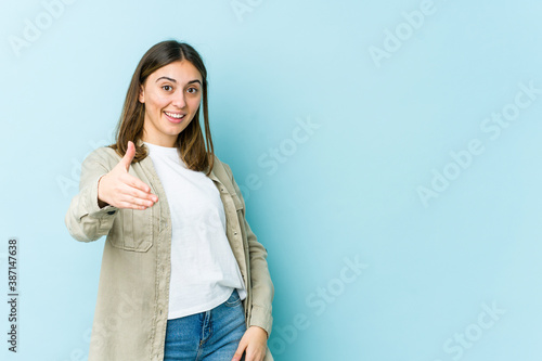 Young caucasian woman stretching hand at camera in greeting gesture.