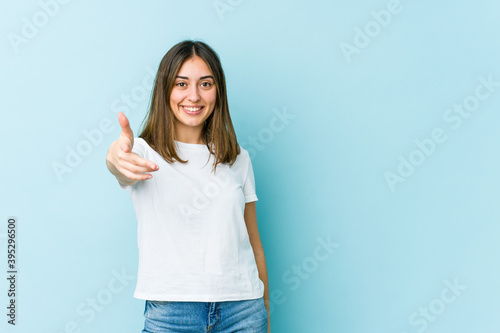 Young caucasian woman stretching hand at camera in greeting gesture.