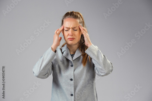 Young caucasian woman suffers from headache, fever, feels sick, ill and weakness isolted on gray studio background. Symptoms of desease or unhealthy lifestyle. Sickness, ilness, sad and upset