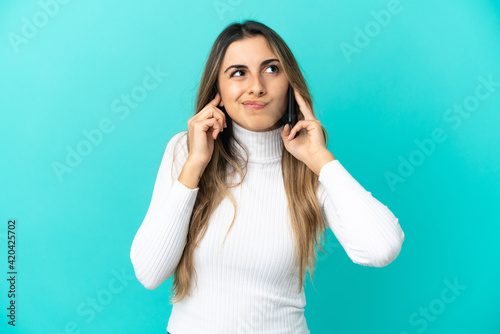 Young caucasian woman using mobile phone isolated on blue background frustrated and covering ears